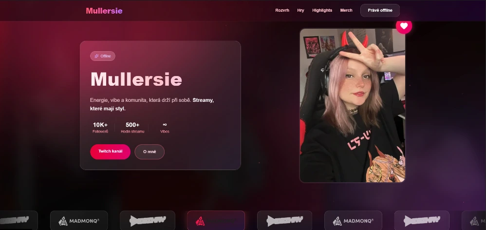 Cílem tohoto projektu nebylo vytvořit další „link v bio“ stránku, ale plnohodnotnou webovou aplikaci, která bude streamerku reprezentovat, zjednoduší komunikaci s komunitou a propojí vše důležité na jednom místě.